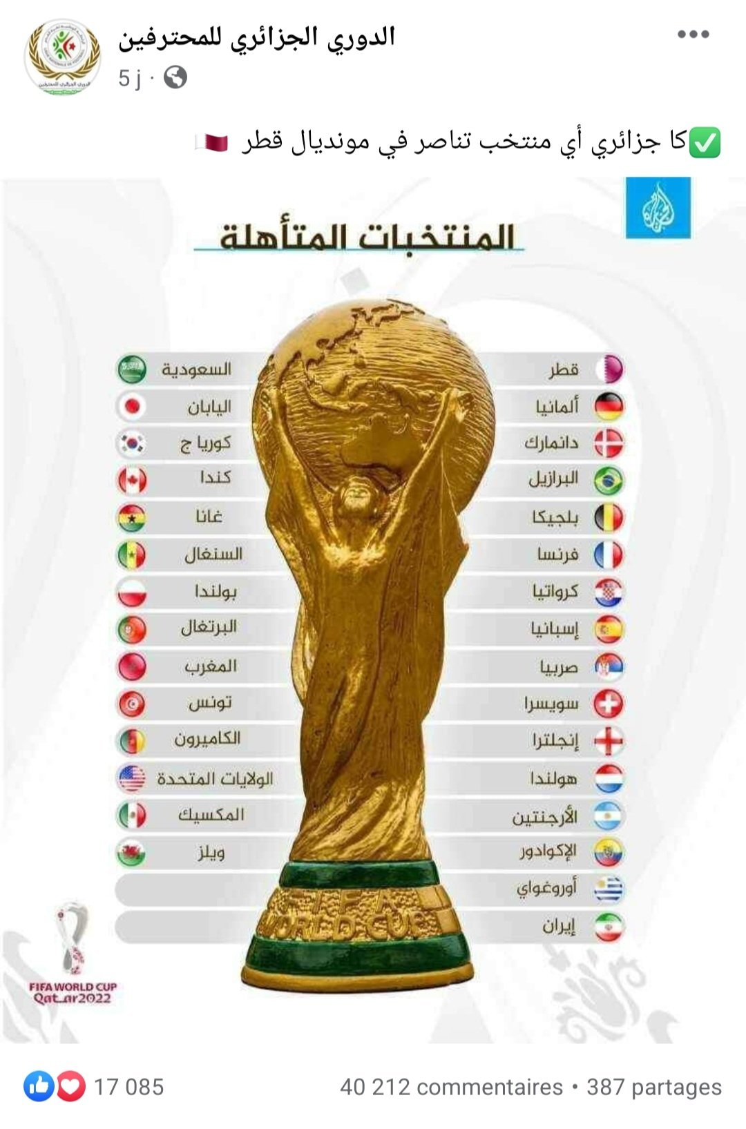أكثر من 40 ألف تعليق، جاء جوابا على سؤال، “كجزائري أي منتخب تناصر في مونديال قطر”، الذي طرح في صفحة الدوري الجزائري للمحترفين بالفيسبوك، الجواب كان صادما لسياسة نشر الفتنة بين الشعبين الشقيقين المغربي والجزائري، وذلك بعد أن علق معظم الجزائريين المشاركين بالتعليق لصالح تشجيع المنتخب المغربي.