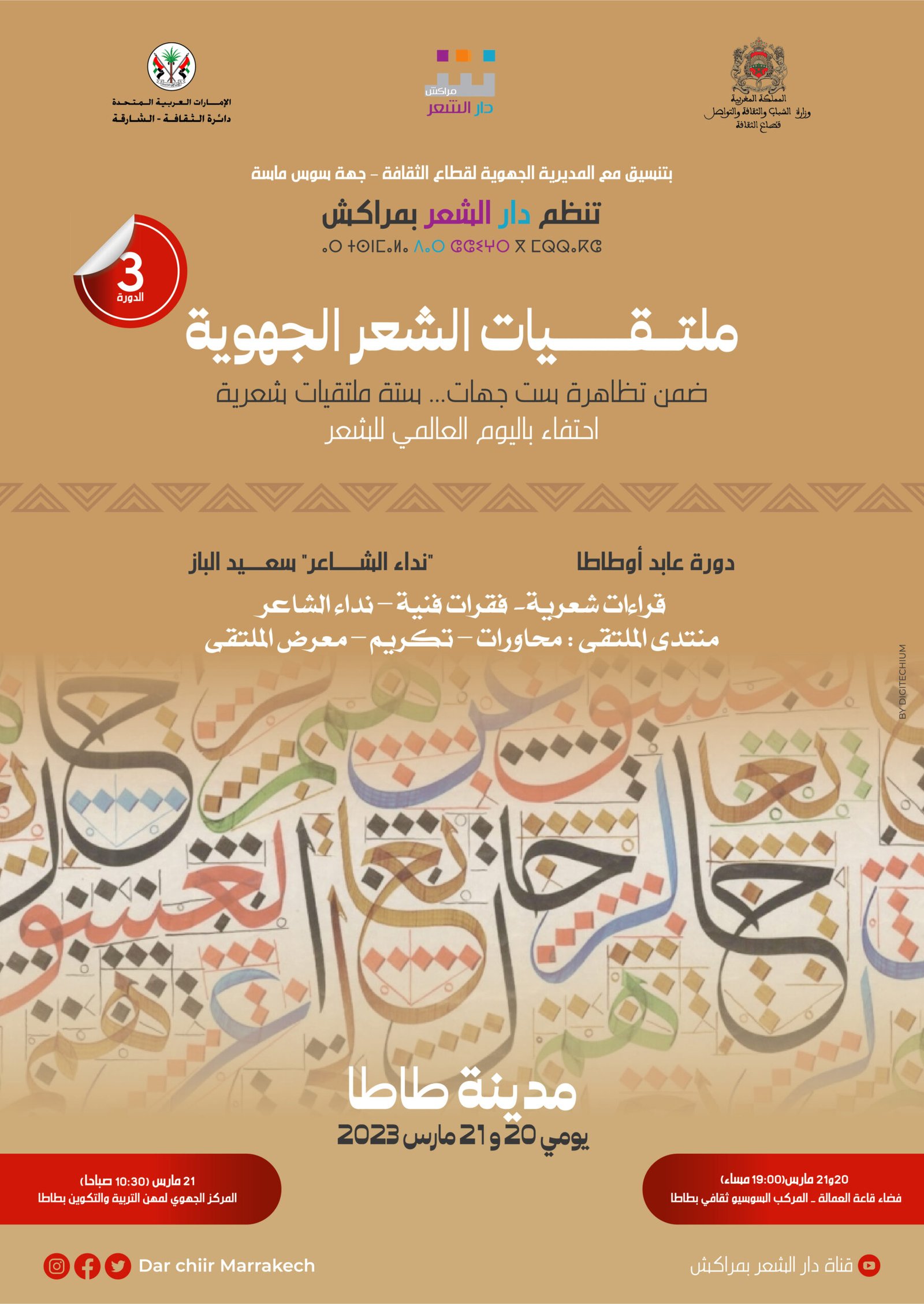 تحت إشراف وزارة الشباب والثقافة والتواصل، قطاع الثقافة وبتنسيق مع المديرية الجهوية لقطاع الثقافة جهة سوس ماسة، تنظم دار الشعر بمراكش الدورة الثالثة لملتقيات الشعر الجهوية، احتفاء باليوم العالمي للشعر، وتحتضن مدينة طاطا فعاليات هذه التظاهرة الشعرية الكبرى يومي 20 و21 مارس 2023، وتشهد تنظيم قراءات شعرية وفقرات موسيقية وندوة محورية ترتبط بأسئلة الشعر والتراث الثقافي المادي واللامادي، ومعرض لإصدارات دار الشعر بمراكش ودائرة الثقافة بالشارقة، وحفل تكريم أحد الوجوه الشعرية والثقافية المرموقة بالجهة.