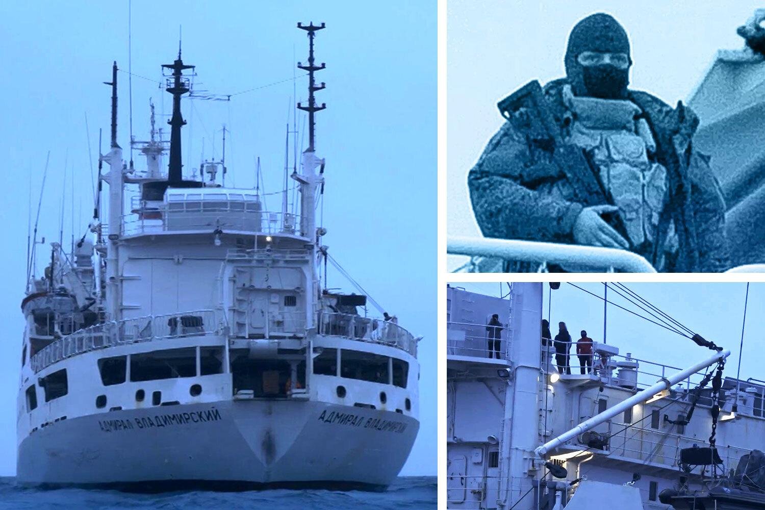 وعندما اقترب فريق من قناة DR بقارب مطاطي من سفينة الأميرال فلاديميرسكي، خرج جنديان ملثمان ومسلحان على ظهر السفينة وأبلغا الفريق بأنه تم رصده، كما جاء في مقطع بثته القناة الدنماركية.