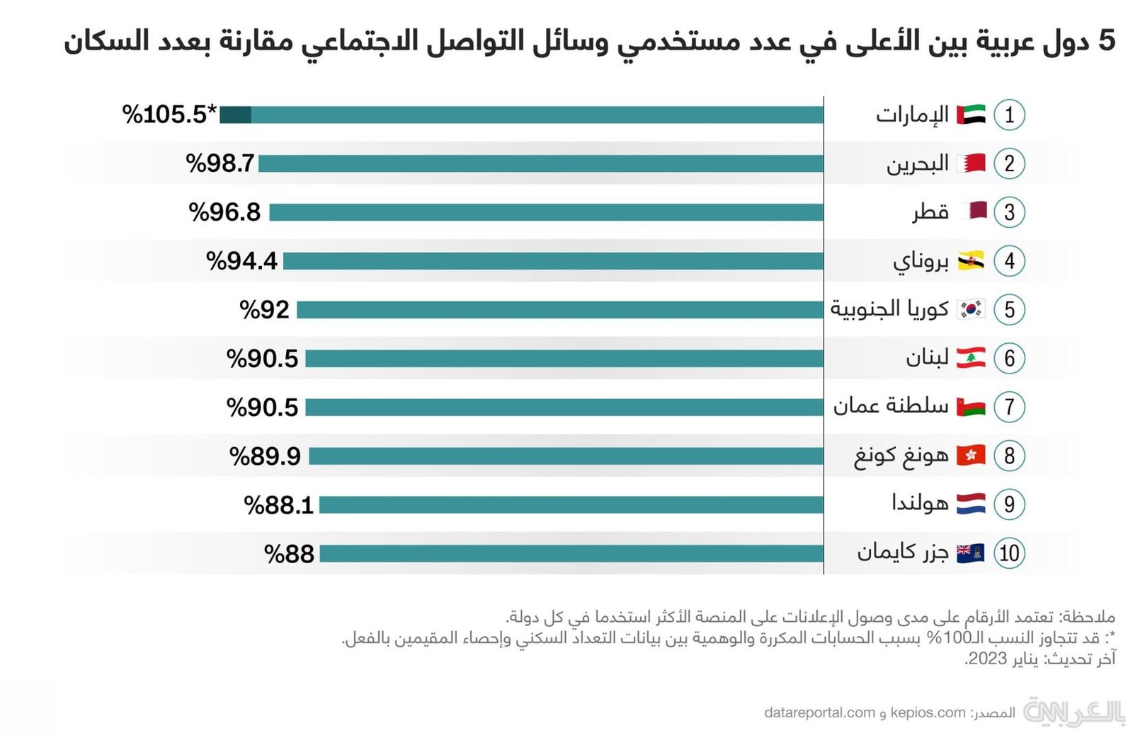 وتصدرت الإمارات المركز الأول بعدد مستخدمي وسائل التواصل الاجتماعي مقابل عدد السكان ليصل حوالي 10 ملايين مستخدم لتصل النسبة لـ 105.5%.