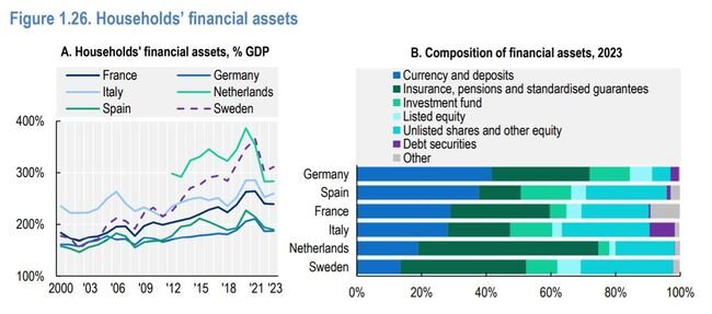 وبهذا الشكل، تشرح منظمة التعاون الاقتصادي والتنمية أن “الأصول المالية للأسر منخفضة أيضًا مقارنة ببقية العالم”، حيث شكلت في عام 2023 ما نسبته 190% من الناتج المحلي الإجمالي، مقارنة بمتوسط 256% المسجل من قبل البلدان المحيطة بإسبانيا.