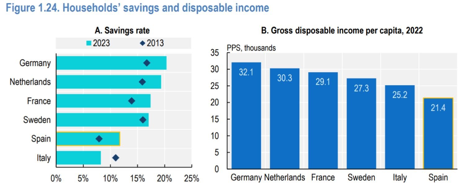 ووفق في الرسم البياني التالي الذي ، ففي حين يتجاوز معدل الادخار في ألمانيا والسويد وفرنسا وهولندا 15%، فإنه في إسبانيا بالكاد يتجاوز 10%، متقدماً فقط على إيطاليا (التي، مع ذلك، هي من بين الدول الأكثر تخلفاً).