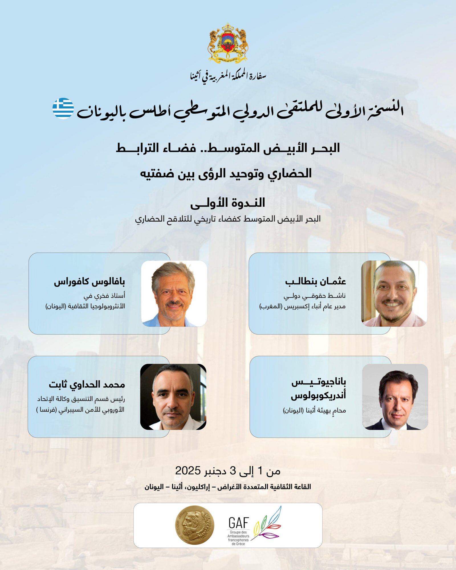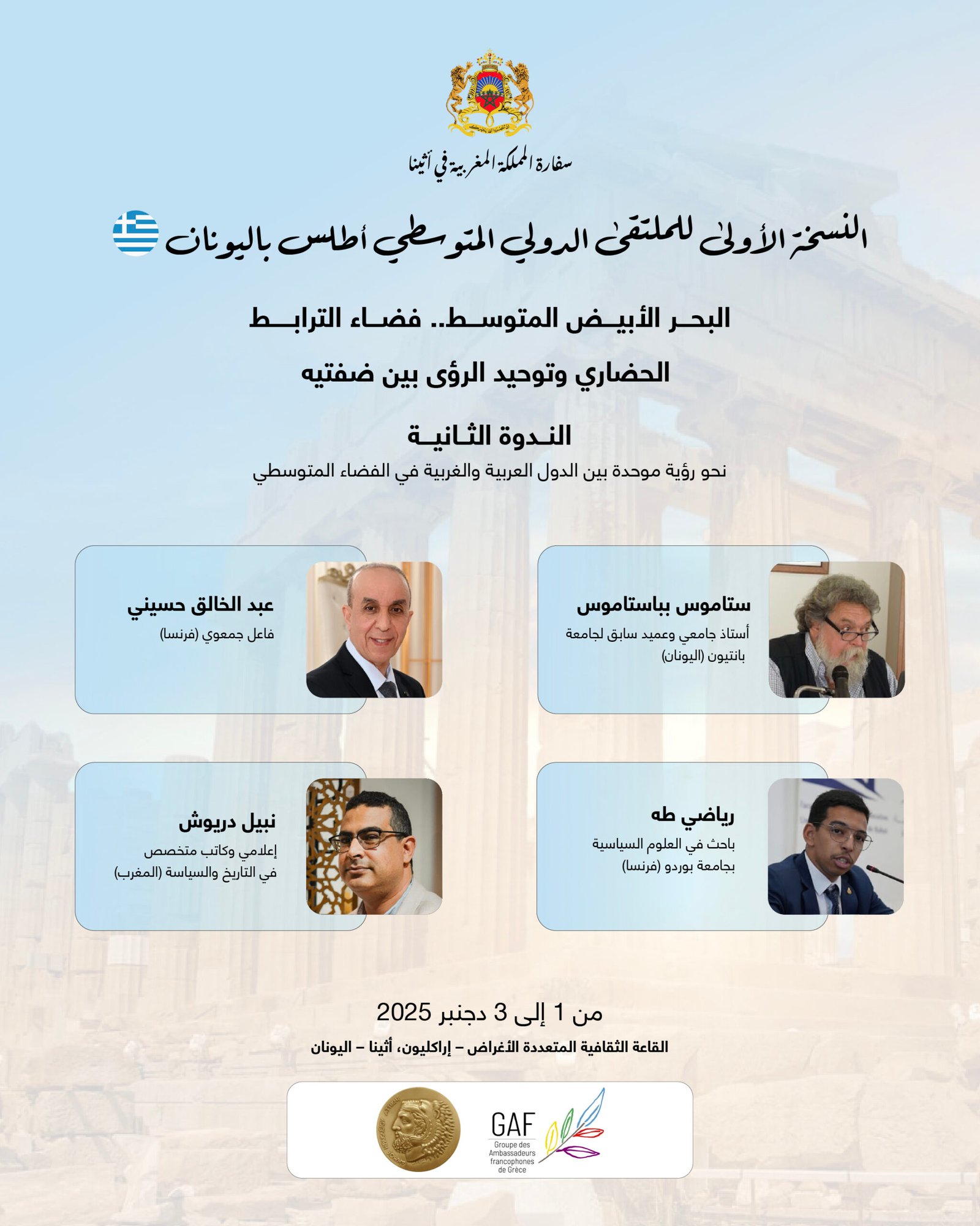 تستضيف مدينة أثينا، مهد الفلسفة والحضارة، من 1 إلى 3 دجنبر 2025، فعاليات الملتقى الدولي المتوسطي في نسخته الأولى “أطلس”، تحت عنوان: “البحر الأبيض المتوسط.. فضاء الترابط الحضاري وتوحيد الرؤى بين ضفتيه”، وذلك بالقاعة الثقافية متعددة الأغراض ببلدية إيراكليون – أثينا، من تنظيم سفارة المملكة المغربية لدى الجمهورية اليونانية وبلدية إيراكليون، وبمشاركة مجموعة من سفراء الدول الفرنكوفونية باليونان وعدد من دول البحر الأبيض المتوسط.