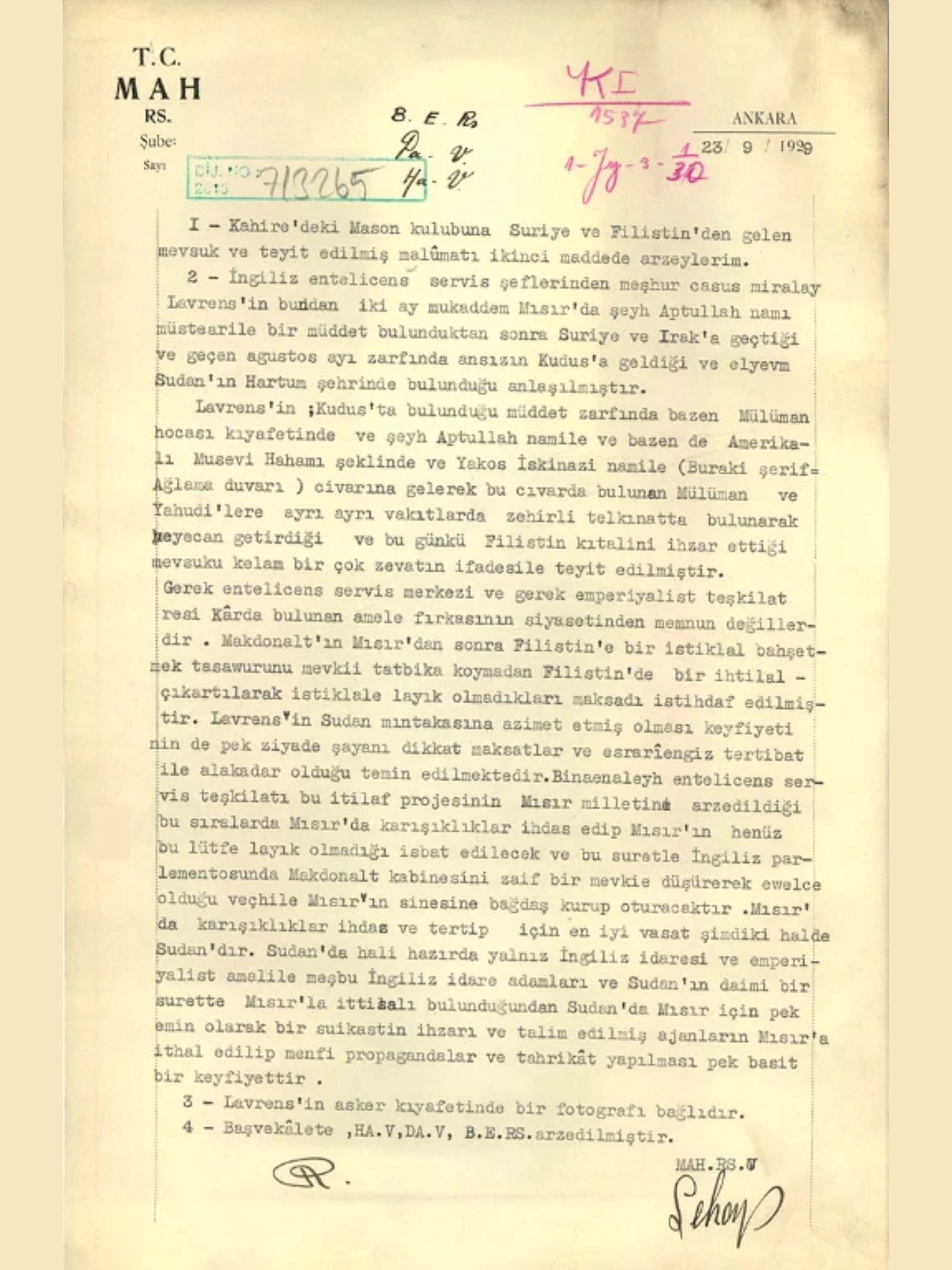 وتحمل الوثيقة تاريخ 23 سبتمبر 1929، وهي عبارة عن مذكرة أعدّتها مديرية جهاز الأمن القومي التركي آنذاك، وجرى توجيهها إلى كل من رئاسة الأركان العامة ووزارتي الداخلية والخارجية.