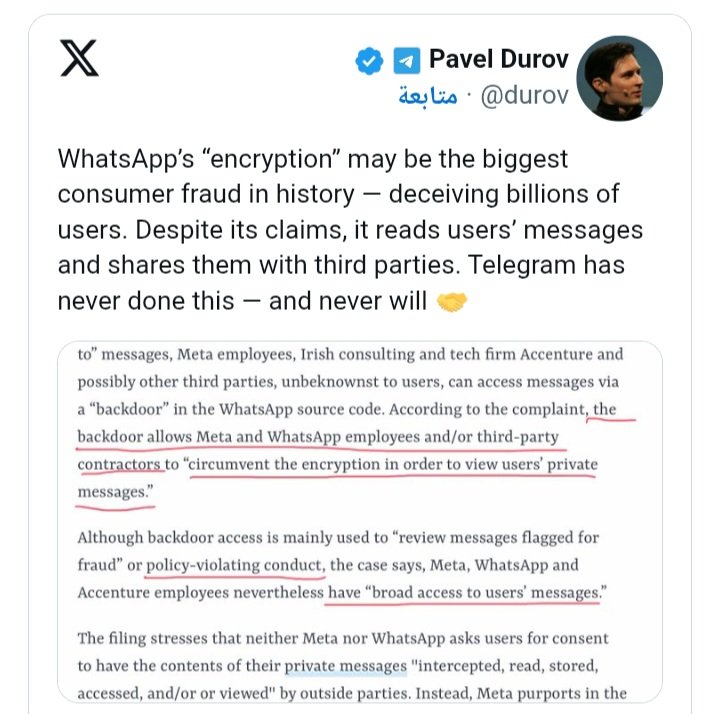 وأرفق دوروف تدوينته بمقتطف من وثيقة قانونية وردت ضمن دعوى قضائية موجهة ضد شركتي “ميتا” و”واتساب”، تشير إلى وجود ما وُصف بـ”باب خلفي” في بنية التطبيق البرمجية، يتيح – وفق الادعاءات – لموظفين أو متعاقدين لدى الشركة تجاوز طبقات التشفير في حالات محددة، خاصة المرتبطة بمراجعة المحتوى المخالف أو الاحتيالي.