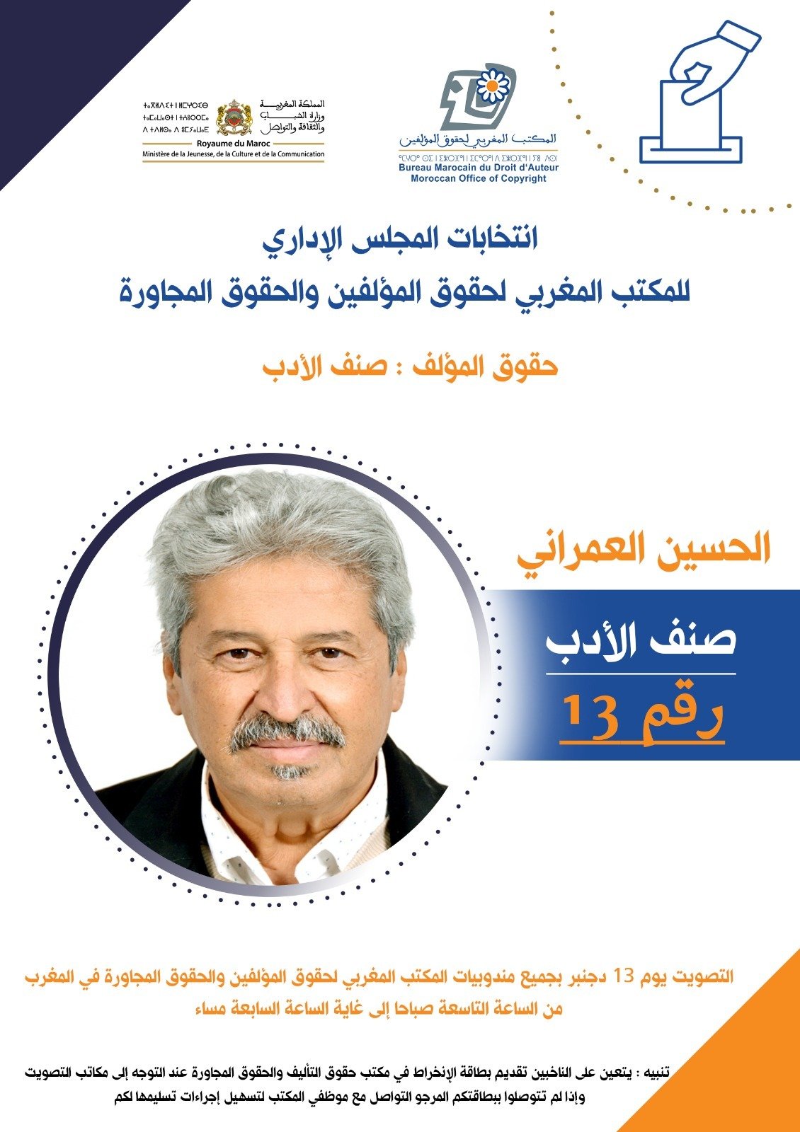 أسفرت النتائج النهائية لانتخابات ممثلي المؤلفين وأصحاب الحقوق المجاورة للعضوية بالمجلس الإداري للمكتب المغربي لحقوق المؤلف والحقوق المجاورة عن فوز الإعلامي والكاتب الحسين العمراني عن صنف الأدب، في محطة تؤكد الثقة التي يحظى بها داخل الوسط الثقافي والإبداعي.