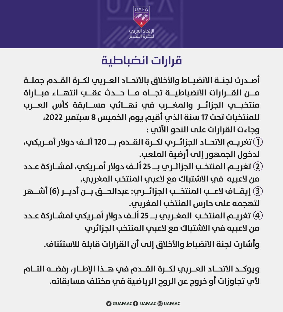 أصدرت لجنة الانضباط والأخلاق بالاتحاد العربي لكرة القدم جملة من القرارات الانضباطية تجاه ما حدث عقب انتهاء مباراة منتخبي الجزائر والمغرب في نهائي مسابقة كأس العرب للمنتخبات تحت 17 سنة الذي أقيم يوم الخميس 8 سبتمبر 2022