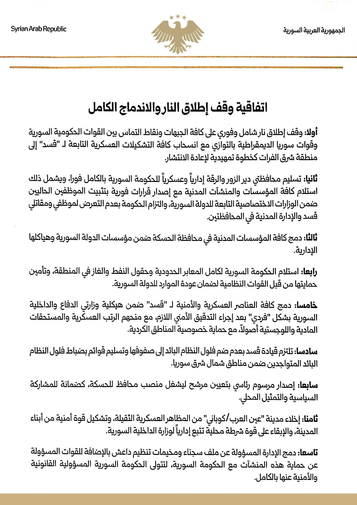 كما ينص على تسليم محافظتي دير الزور والرقة إدارياً وعسكرياً للحكومة السورية فوراً، وتسليم المعابر الحدودية وحقول النفط والغاز للدولة، مع تكليف القوات النظامية بحمايتها.